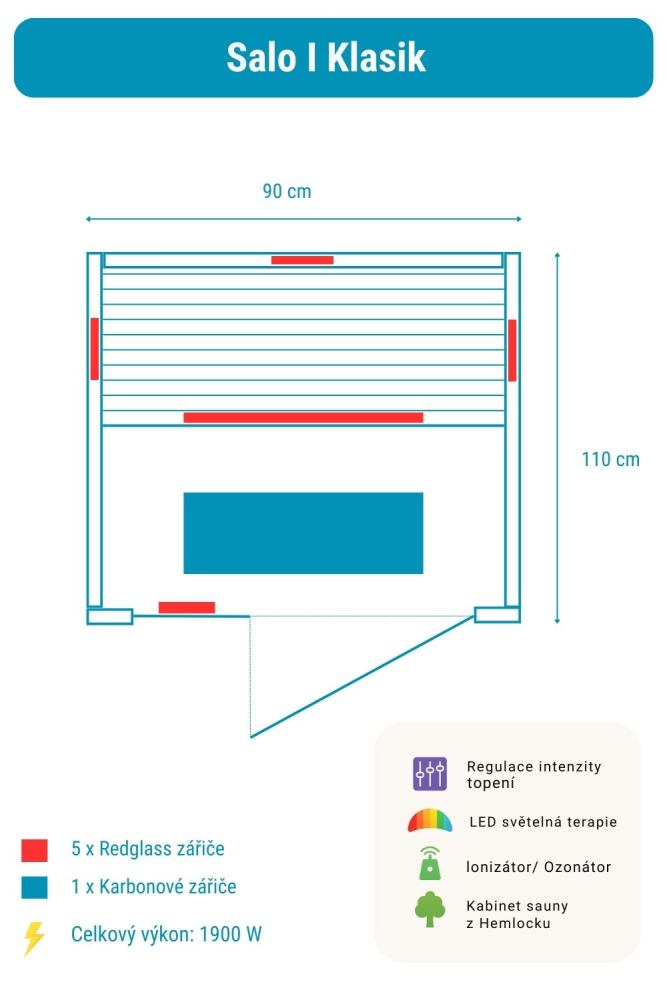 Infrasauna Salo 1 Klasik obsahuje: Sada pro ovládání infrasauny 4 ks plnospektrálních zářičů 1 ks nastavitelný čelní zářič s plynulou regulací 1 ks podlahový karbonový zářič Regulaci intenzity topení LED světelnou terapii "HVĚZDNÉ NEBE" Ionizátor / Ozonátor Kabinet sauny z Hemlock Prodlou Zobrazit více